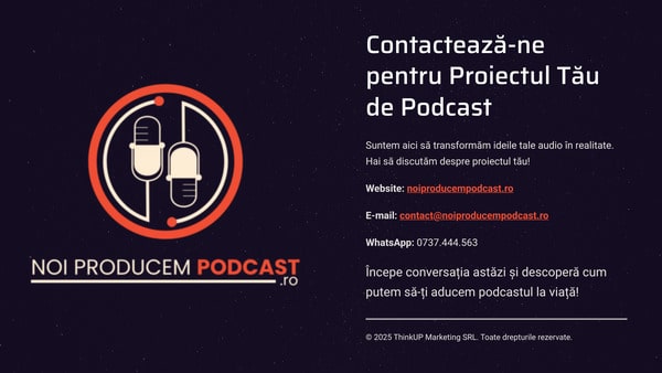 Ai nevoie de ajutor profesional? Echipa noastra de la Noi Producem Podcast poate transforma ideea ta intr-un podcast de succes, de la productie la promovare si monetizare. Contacteaza-ne pentru o consultatie gratuita!