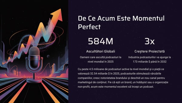 Peste 4.5 milioane de podcasturi active exista la nivel global, dar multe dintre ele nu reusesc sa supravietuiasca primului an. De ce? Lipsa unei strategii clare si a cunostintelor tehnice necesare. Ghidul nostru iti ofera exact fundatia de care ai nevoie pentru a evita aceste capcane si a construi un podcast de succes de la zero.